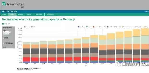 根據(jù)德國Fraunhofer整理的最新數(shù)據(jù),2016年德國電力總裝機容量達194.53GW,其中太陽能40.41GW、海上風電4.13GW、陸上風電44.80GW、天然氣28.27GW、燃油4.19GW、硬煤28.38GW、褐煤20.90GW、核電10.80GW、生物質(zhì)7.06GW、水電5.59GW。與2015年相比,太陽能裝機凈增1.08GW、陸上風電凈增3.55GW、海上風電凈增0.70GW,與往年相比太陽能光伏裝機增長速度已經(jīng)大大下降。