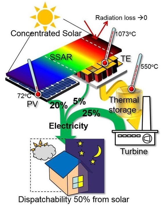 同時(shí),研究者們采用一種全新設(shè)計(jì)的“選擇性的太陽(yáng)能吸收器和反射鏡”熱電裝置,能將太陽(yáng)光熱低能光子轉(zhuǎn)化為電能,生成約5%的電能;與此同時(shí),該熱電裝置通過(guò)使用鏡組聚光,將熱量收集并進(jìn)行存儲(chǔ),驅(qū)動(dòng)蒸汽渦輪,生成約占本系統(tǒng)25%的電能。
