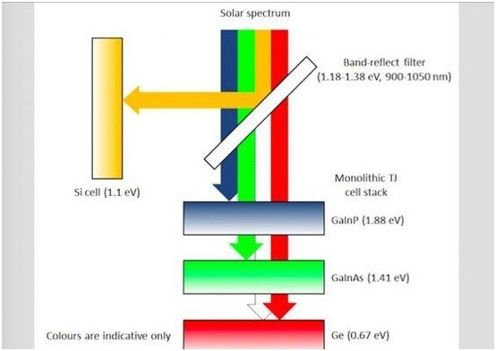 在玻璃棱鏡的一側(cè),是一片硅光電池(silicon cell);在另一邊,則是三結(jié)太陽(yáng)能電池(triple-junction solar cell)。這種太陽(yáng)能電池有三層,各自對(duì)應(yīng)不同的光波,能夠最有效地利用光能,而剩下的光能會(huì)傳遞到下一層、最終紅外光波會(huì)被篩出反彈到硅光電池那邊。