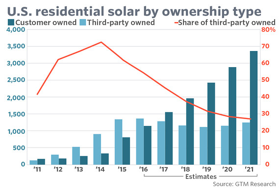 但是,SolarCity的這種模式可能無法再繼續(xù)運行下去。市場研究公司GTM Research預計,2017年,多數(shù)用戶將以現(xiàn)金或貸款的方式直接購買太陽能系統(tǒng)。GTM稱,租賃或第三方擁有的太陽能系統(tǒng)占據(jù)了今年太陽能系統(tǒng)市場的大約54%,明年將降至45%,未來5年內(nèi)將逐步降低至30%以下。