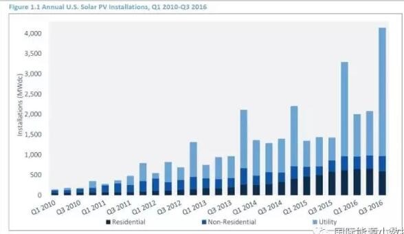 中國儲能網(wǎng)訊:美國第三季度光伏裝機達(dá)到4.143GW(其中加利福尼亞裝機超過1GW),相比今年第二季度增幅為99%,相比去年第三季度增幅高達(dá)191%。這是美國歷史上單季度光伏裝機容量最高紀(jì)錄,相當(dāng)于每32分鐘就有1兆瓦裝機竣工。2016年第一季度至第三季度,光伏裝機占全美新增電力裝機的39%,僅次于天然氣裝機增量。