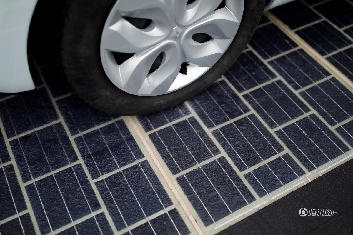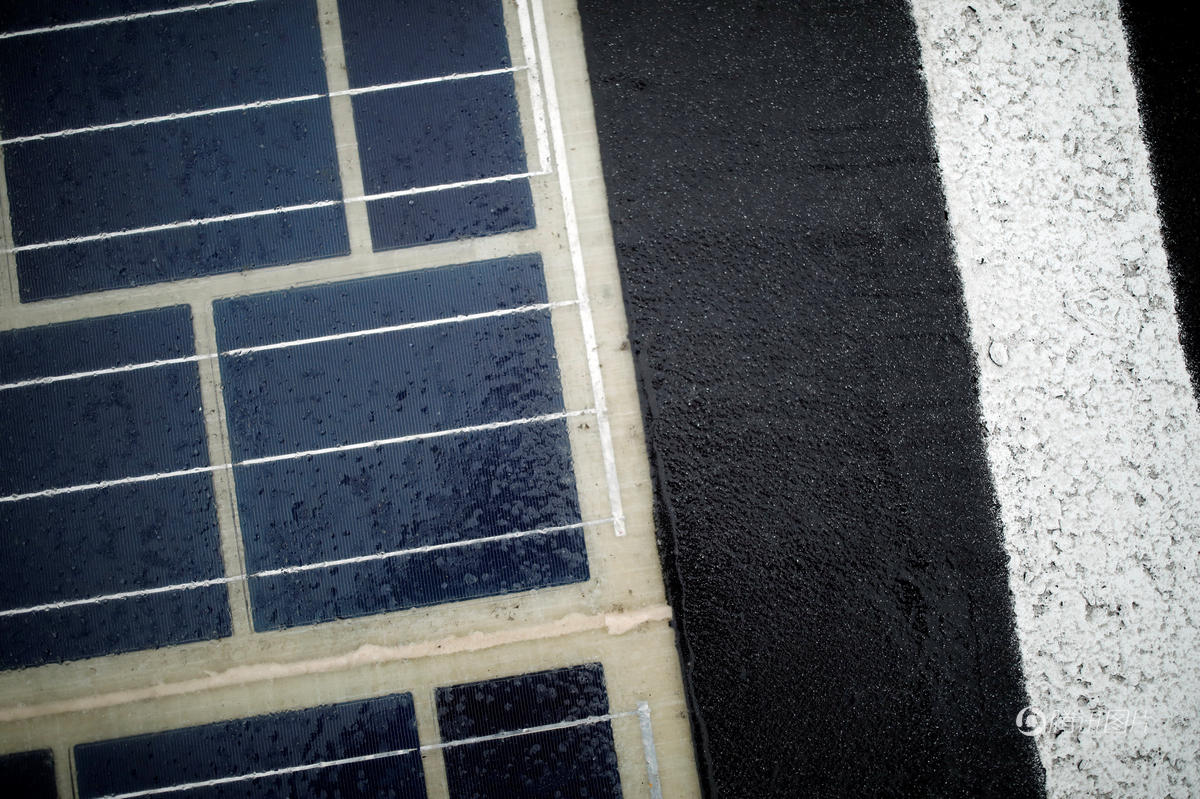 工程人員在涂滿泊油的路上,鋪了幾千米的太陽(yáng)能面板。其脆弱的光伏板被一種混合聚酯層保護(hù)著,可以經(jīng)得起汽車(chē)及各種輕重型車(chē)輛經(jīng)常的往來(lái)路壓。這種半透明的混合材質(zhì)可以讓陽(yáng)光透過(guò)去,被硅分子吸收進(jìn)去。