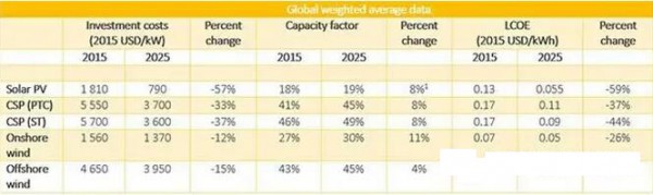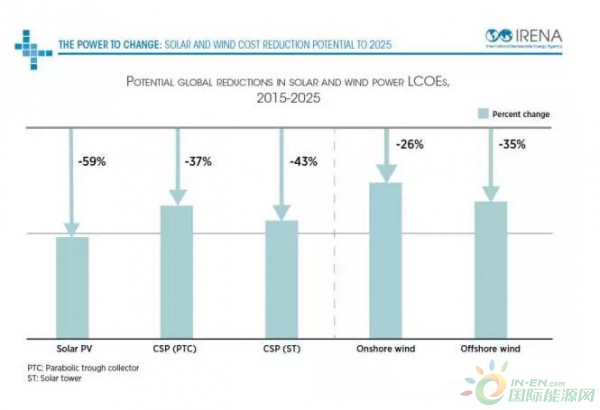 中國儲能網(wǎng)訊:根據(jù)國際可再生能源署剛剛發(fā)布的報告預測,光伏、光熱、陸上和海上風電成本將大幅度下降:
