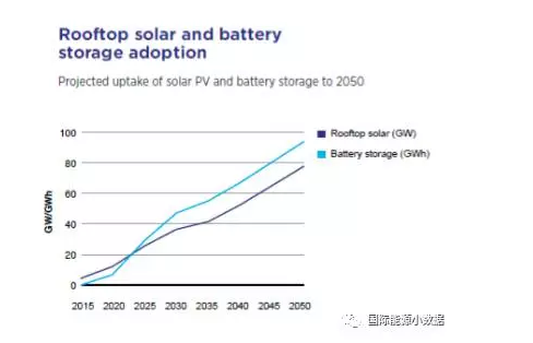 很顯然,如果風(fēng)電、光伏發(fā)電接近100%,那么必須應(yīng)用儲(chǔ)能技術(shù)。問(wèn)題是使用什么樣的儲(chǔ)能技術(shù),誰(shuí)來(lái)買單?研究表明,在澳大利亞,最重要的儲(chǔ)能將來(lái)自“電表后”(需求側(cè))的儲(chǔ)能,即1000萬(wàn)居民與商業(yè)用電戶的屋頂光伏與電池儲(chǔ)能結(jié)合。根據(jù)這份研究下繪制的路線圖,澳大利亞屋頂光伏裝機(jī)到2026年將達(dá)20GW,2050年可望達(dá)到80GW;相應(yīng)的儲(chǔ)能規(guī)模2026年為32GWh、2050年87GWh,而這些儲(chǔ)能將大部分來(lái)自“電表后”,是用電戶的市場(chǎng)行為(降低電費(fèi))。