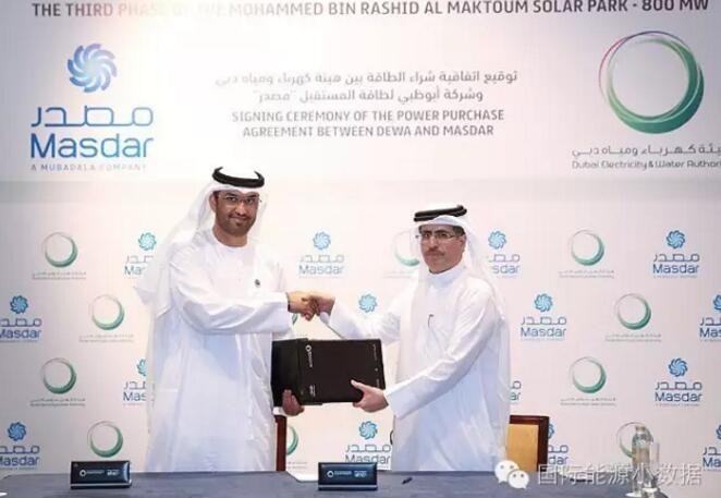 中國儲(chǔ)能網(wǎng)訊:2016年11月29日,迪拜電力和供水機(jī)構(gòu)(DEWA)與阿布扎比未來能源公司(Masdar)正式簽署了迪拜(Mohammedbin Rashid Al Maktoum Solar Park)光伏園第三期800兆瓦項(xiàng)目的購電協(xié)議,成交價(jià)格為0.299美分/千瓦時(shí),創(chuàng)全球歷史上最低的光伏價(jià)格。