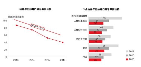 最后看這種狀態(tài)能持續(xù)多久。雖然油價低于全成本但高于邊際成本時短期內(nèi)不會出現(xiàn)大幅減產(chǎn),但畢竟處于不斷失血的虧損狀態(tài),如果油價持續(xù)下跌或虧損過多,油公司最終還是會被迫停產(chǎn),打不了持久戰(zhàn)。沙特正是看到了這一點(diǎn),才死扛著不減產(chǎn)。美國頁巖油公司當(dāng)然也知道自己的軟肋,積極通過采取減少作業(yè)鉆機(jī)數(shù)量、聚焦“甜點(diǎn)區(qū)”、壓縮作業(yè)量和提高新井產(chǎn)量等措施進(jìn)行降本增效。根據(jù)2016年7月Rystad Energy發(fā)布的數(shù)據(jù),美國頁巖油平均井口盈虧平衡價格在2013年-2016年的年均降幅為22%,表現(xiàn)出極強(qiáng)的適應(yīng)能力。
