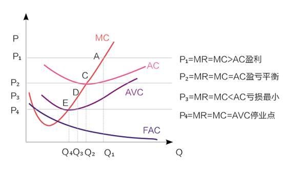 (1)當(dāng)價格(邊際收益)為P1時,A點(diǎn)對應(yīng)產(chǎn)量Q1。此時,邊際收益(MR)=邊際成本(MC)>平均成本(AC),廠商處于盈利狀態(tài)(超額利潤)。