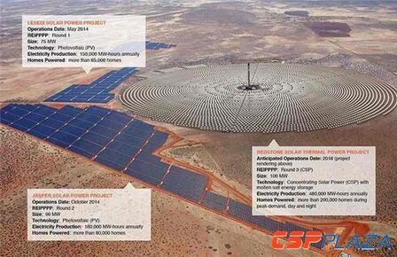 目前南非正在建設(shè)全球第一個(gè)混合了光伏和光熱發(fā)電的大型太陽(yáng)能園區(qū),總裝機(jī)達(dá)到271MW。該園區(qū)由國(guó)際知名塔式熔鹽光熱發(fā)電項(xiàng)目開(kāi)發(fā)商Solar Reserve和沙特ACWA電力公司共同開(kāi)發(fā)的南非裝機(jī)為100MW的塔式熔鹽光熱電站Redstone和有Solar Reserve和其合作方已開(kāi)發(fā)的75MW的Lesedi光伏電站和96MW的Jasper光伏電站組成,該項(xiàng)目集聚光太陽(yáng)能與光伏太陽(yáng)能于一體,以最低成本提供具備高產(chǎn)能系數(shù)的基礎(chǔ)負(fù)荷可再生能源,可完全取代燃煤發(fā)電。