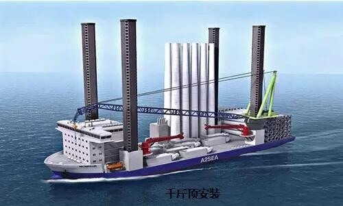 海上風(fēng)電機(jī)組的安裝可通過千斤頂駁船或者浮吊船完成。