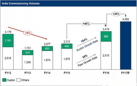 2015年4月29日,蘇司蘭出售其在德國風(fēng)機(jī)市場(chǎng)股份,到9月底,風(fēng)機(jī)訂單量急速上漲到1136MW,價(jià)值716.5億印度盧比。2015財(cái)年,蘇司蘭在印度風(fēng)機(jī)市場(chǎng)發(fā)展良好,裝機(jī)容量達(dá)到3400MW,預(yù)計(jì)到2017年可增長30%。