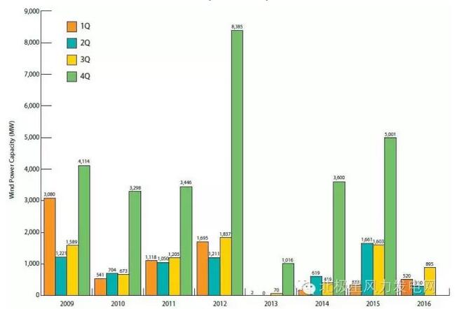 美國風(fēng)電新增裝機(jī)量2009-2016(按季度)