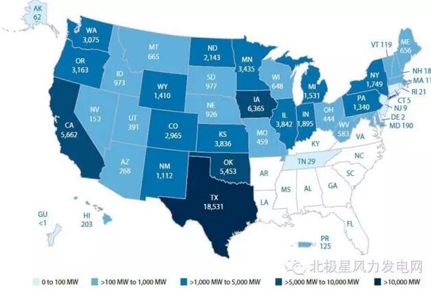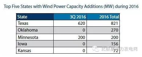 2016年美國風(fēng)電新增裝機(jī)州TOP5