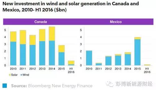 2016年上半年,在經(jīng)過2010到2014年的平穩(wěn)期后,加拿大風電和光伏領(lǐng)域的新投資在2015年急劇下降。預(yù)計,2016年的投資額將再次下跌。2015年,墨西哥可再生能源產(chǎn)業(yè)共吸引了創(chuàng)紀錄的40億美元,展示了相當不錯的潛力,但2016年初的投資情況未能繼續(xù)保持良好勢頭。