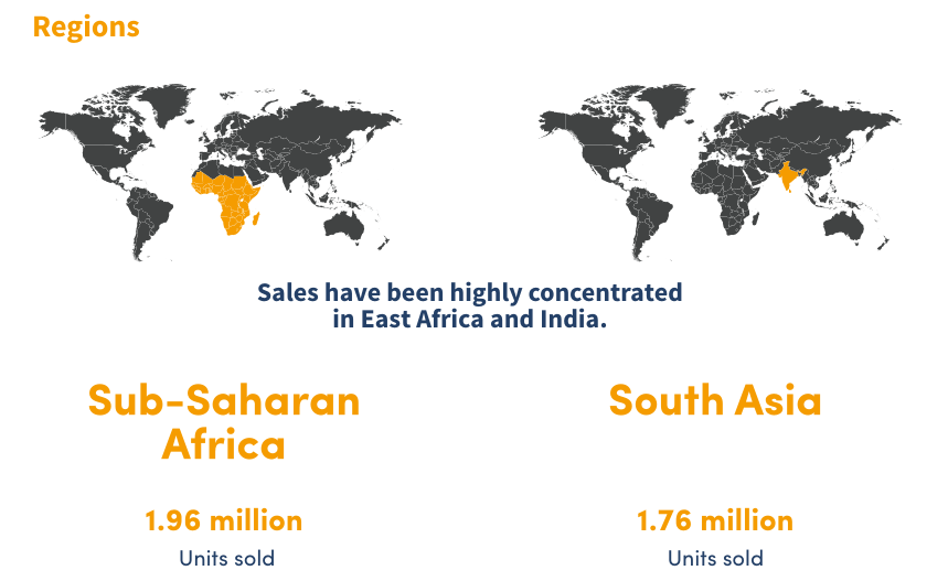 其中,在撒哈拉沙漠以南非洲地區(qū)中,東非占區(qū)域總銷(xiāo)量的70%,占區(qū)域總收入的77%。而南亞地區(qū)的離網(wǎng)太陽(yáng)能市場(chǎng)主要集中在印度市場(chǎng),在區(qū)域銷(xiāo)售總量176萬(wàn)單位中,印度占172萬(wàn)單位。