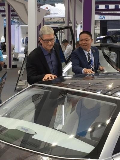 10 月 12 日,庫克在深圳“雙創(chuàng)周”中亮相,并在漢能展臺(tái)仔細(xì)琢磨漢能太陽能動(dòng)力汽車和砷化鎵薄膜發(fā)電技術(shù)。