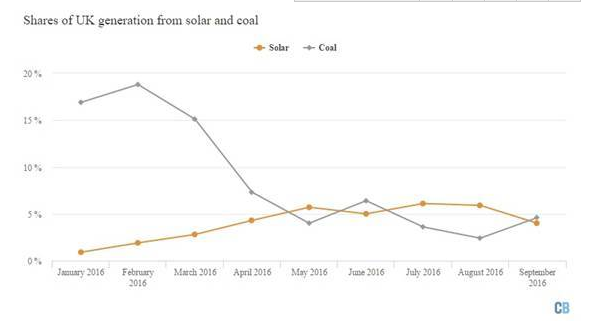 政府對(duì)太陽(yáng)能發(fā)展的大力推崇取得了良好的效果。氣候變化分析網(wǎng)站CarbonBrief的數(shù)據(jù)顯示,英國(guó)的太陽(yáng)能發(fā)電量在過(guò)去的6個(gè)月里已經(jīng)超過(guò)火力發(fā)電廠的發(fā)電量。