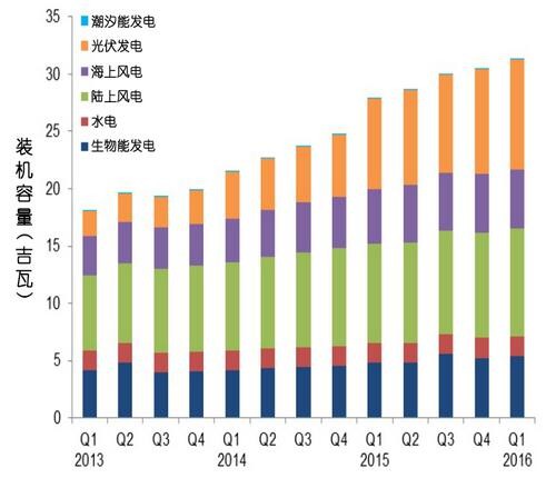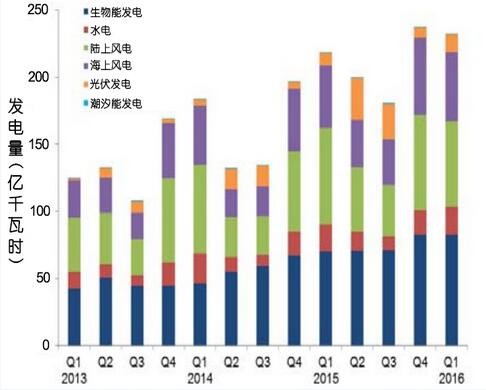 陸上及海上風(fēng)電裝機(jī)容量同比增長分別為7.6%(0.7吉瓦)和7.5%(0.4吉瓦)。多家陸上風(fēng)電場開始運(yùn)行,包括2016年第一季度投運(yùn)的60兆瓦M(jìn)oy風(fēng)電場。海上風(fēng)電裝機(jī)容量增長主要是由于WestermostRough等多家風(fēng)電場建設(shè)完工,2016年第一季度海上風(fēng)電裝機(jī)容量并沒有新的增長。