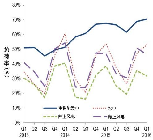 生物能源發(fā)電負(fù)荷率在2016年第一季度為70.6%,同比增長3個(gè)百分點(diǎn),環(huán)比增長1.8個(gè)百分點(diǎn),創(chuàng)歷史新高。此次變化側(cè)面反映出Drax發(fā)電廠三號(hào)機(jī)組完成生物質(zhì)混燃發(fā)電的轉(zhuǎn)型(從85%變?yōu)?00%生物燃料)。