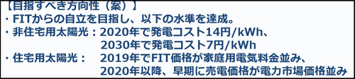 作為價(jià)格目標(biāo)的事務(wù)局案,提出了以從FIT獨(dú)立為目標(biāo)的價(jià)格水平:非住宅用途2020年的發(fā)電成本為14日元/kWh,2030年為7日元/kWh;住宅用途到2019年與家用電費(fèi)相當(dāng),2020年以后盡快與批發(fā)電力市場(chǎng)的價(jià)格相當(dāng)。