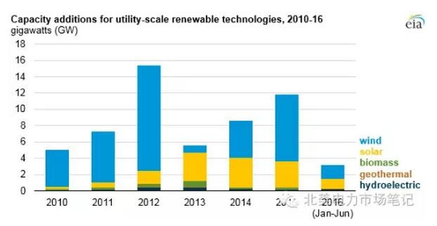 近3年美國新增發(fā)電裝機(jī)中非水電可再生能源發(fā)電裝機(jī)占主導(dǎo)地位。而近幾年來太陽能和風(fēng)電廠建造成本也在迅速下降。還有很多因素刺激了非水電可再生能源的增長(zhǎng),包括各州對(duì)可再生能源的份額要求和稅收優(yōu)惠政策。關(guān)鍵稅收抵免政策,包括production tax credit和investment tax credit,在近年來都產(chǎn)生了重要影響,并在2015年12月此政策獲得了延長(zhǎng)。