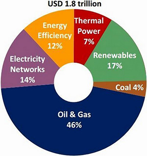 從投資明細(xì)來看,雖然石油˙天然氣˙煤炭占投資總額的50%,但是算上火力發(fā)電,同比降低6%??稍偕茉凑纪顿Y總額的17%,增加了1%,電網(wǎng)占投資總額的14%,增加2%;節(jié)能相關(guān)的投資增加到12%,同比增加2%。全球能源產(chǎn)業(yè)正向減少二氧化碳排放量,能源轉(zhuǎn)移方向發(fā)展。