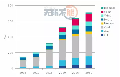 為滿足日益增長(zhǎng)的電力需求,近年來印度電力供應(yīng)端同時(shí)發(fā)展迅速。在2005-2015年間,印度的電力裝機(jī)容量以8.4%的年均增長(zhǎng)率穩(wěn)定增長(zhǎng),達(dá)到320千瓦。其中火力發(fā)電量(煤炭)占63%,水力發(fā)電量占13%,天然氣發(fā)電量占9%。增長(zhǎng)的電力裝機(jī)容量主要包括120千瓦的火力發(fā)電量、陸上風(fēng)力發(fā)電量以及天然氣發(fā)電量分別為21千瓦以及12千瓦。盡管目前化石燃料發(fā)電量占據(jù)了印度電力裝機(jī)容量的73%,但Enerdata預(yù)計(jì):非化石燃料能源(太陽能、風(fēng)能以及核能)電力裝機(jī)容量將在2020年以及2030年分別達(dá)到31%和39%。