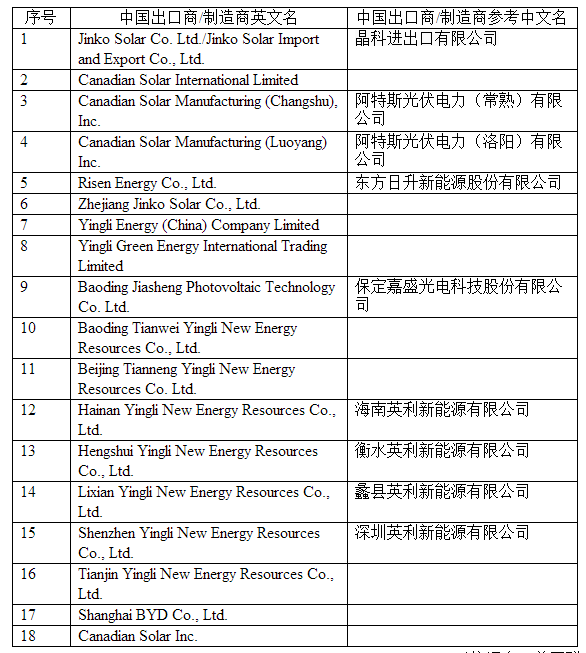 中國(guó)儲(chǔ)能網(wǎng)訊:2016年9月7日,美國(guó)商務(wù)部發(fā)布公告稱,部分取消對(duì)華晶體硅光伏產(chǎn)品的調(diào)查期為2014年7月31日~2016年1月31日的反傾銷行政復(fù)審。美國(guó)商務(wù)部本次撤銷行政復(fù)審調(diào)查的27家中的18家中國(guó)涉案企業(yè)名單詳見(jiàn)下表。