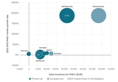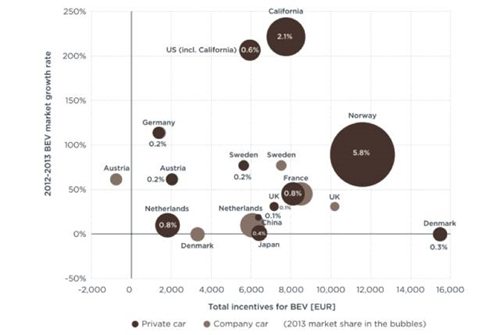 國家的財政補貼政策能夠有力拉動了電動汽車的增長。這一點主要表現(xiàn)在挪威、荷蘭等國:挪威對于純電動汽車的財稅激勵大約為11500歐元(相當(dāng)于機動車基礎(chǔ)價格的55%),其2013年市場份額為6%,相對2012年增長90%。同樣,荷蘭對于插電混合動力的財稅激勵大約為38000歐元(相當(dāng)于機動車基礎(chǔ)價格的75%),其2013年市場份額達5%,相對2012年增長1900%。
