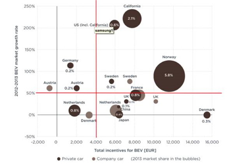 圖中,圓點的大小表示純電動汽車的市場份額,與圓點上的百分比相對應(yīng);橫坐標(biāo)表示純電動汽車的激勵力度;縱坐標(biāo)表示從2012年到2013年,純電動汽車的市場增長率。深色點表示私家車,淺色點表示公司汽車。