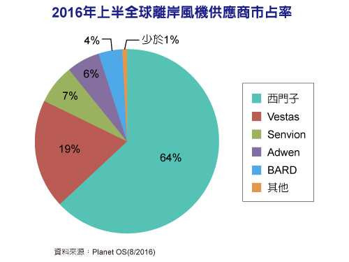 全球海上風(fēng)電迎來(lái)新一波發(fā)展熱潮。據(jù)研究機(jī)構(gòu)Planet OS統(tǒng)計(jì),2016年上半全球海上風(fēng)電容量比2015年增加4.2%,總發(fā)電容量達(dá)到12,672百萬(wàn)瓦(MW)。值得注意的是,2016年上半新增的114個(gè)并網(wǎng)型風(fēng)力發(fā)電機(jī)組全部都由西門子(Siemens)拿下。也由于西門子在2016年上半大獲全勝,拿下全球所有并網(wǎng)型離岸風(fēng)機(jī)市場(chǎng),其全球累積市占率進(jìn)一步拉高到64%,與排名第二的Vestas差距拉大。其他主要風(fēng)機(jī)供應(yīng)商還有Senvion、Adwen等業(yè)者。