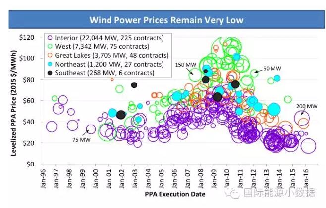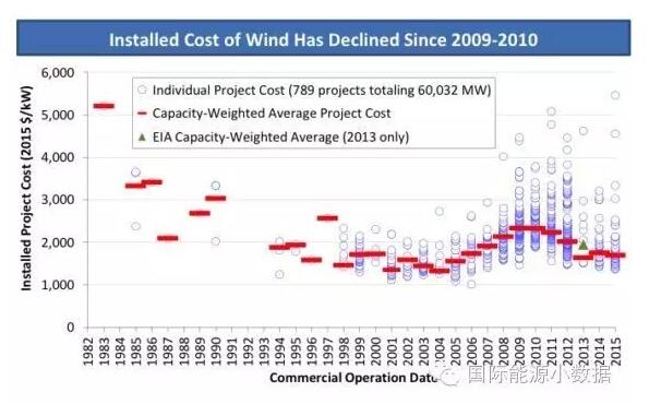 美國陸上風(fēng)電成本創(chuàng)歷史新低,2015年風(fēng)電平均裝機成本1690美元/千瓦,比2010年前后的高點下降了640美元/千瓦。