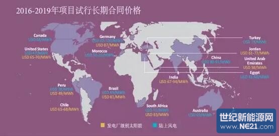 由于科學(xué)技術(shù)的提升、可再生能源市場(chǎng)的擴(kuò)大、融資條件的優(yōu)化,以及長(zhǎng)期購(gòu)電合同為基礎(chǔ)的價(jià)格競(jìng)爭(zhēng)模式的普及,可再生能源的效益近年來(lái)持續(xù)提升。據(jù)近期公布的長(zhǎng)期購(gòu)電利潤(rùn)回報(bào)合同顯示,可再生能源發(fā)電成本在未來(lái)幾年內(nèi)仍有下降的可能。目前,大多數(shù)國(guó)家新建陸上風(fēng)電場(chǎng)合同電價(jià)為60~80美金/MWh,最低的為50美金/MWh(如:巴西、秘魯、埃及等)。太陽(yáng)能光伏發(fā)電場(chǎng)合同電價(jià)為80~100美金/MWh(如:法國(guó)、德國(guó)和烏拉圭),最低的可達(dá)60美金/MWh(如:智利、秘魯、南非等)。