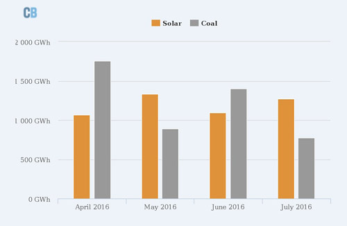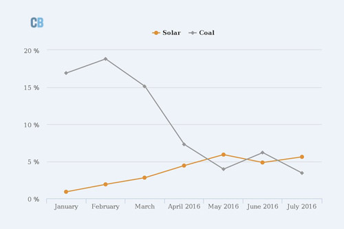 該媒體的報道稱,日光伏發(fā)電量首次超過煤炭火力是在2016年4月9日。同樣,周光伏發(fā)電量超過煤炭火力是5月3日那周。