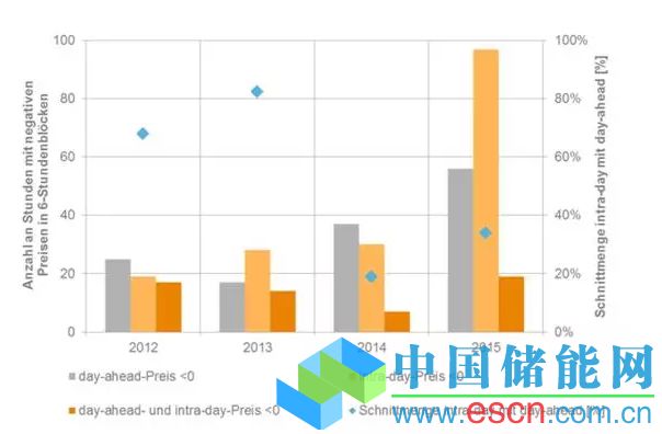 《德國可再生能源法案》(2014年版)第24條并未對負(fù)電價作出明確規(guī)定。幾乎所有市場參與者都認(rèn)定,以日前市場為負(fù)為準(zhǔn),大多數(shù)研究也是基于這個假設(shè)。就在2015年年末,政府在修訂案中提出:2016年日前市場和當(dāng)天市場必須同時在連續(xù)6小時內(nèi)呈負(fù)電價,才終止市場紅利。下圖將展示過去日前價格和當(dāng)日價格,從圖中可以看出將會帶來哪些新的風(fēng)險,幸運的是,風(fēng)險并不大。