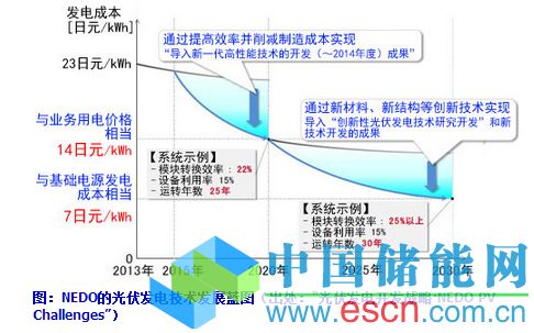 對新一代光伏發(fā)電領域的技術影響,戰(zhàn)略中寫明了“轉換效率要提高至目前普及的光伏發(fā)電的2倍、;通過降低制造和設置成本并大幅提高發(fā)電效率,實現(xiàn)與基礎電源相當?shù)陌l(fā)電成本(7日元/kWh)。這些影響預測與NEDO(新能源產業(yè)技術綜合開發(fā)機構)2014年9月發(fā)布的“光伏發(fā)電開發(fā)戰(zhàn)略(NEDOPVChallenges)”是相協(xié)調的(圖)。