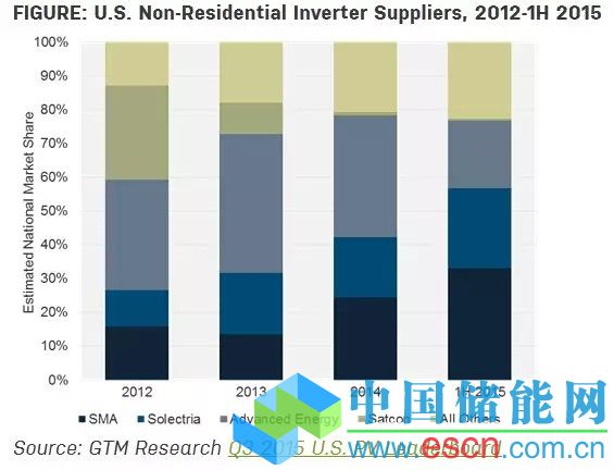 那么,AdvancedEnergy留下的市場(chǎng)空白由誰(shuí)來(lái)填補(bǔ)呢?根據(jù)GTM最近的美國(guó)光伏排行榜,市場(chǎng)份額被順位而下的大型供應(yīng)商占據(jù)。2015年上半年,SMA和Solectria分別占據(jù)了8.8%和5.5%的非戶用逆變器市場(chǎng)份額。