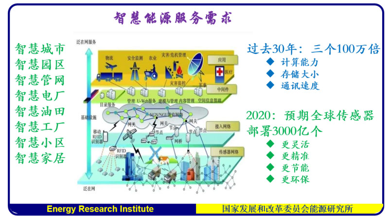 我們看國際上,過去30年,三個(gè)100萬倍,未來30年,再提高100萬倍,對(duì)我們能源系統(tǒng)是什么樣的沖擊?預(yù)期全球傳感器到2020年將部署3000億個(gè)。