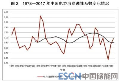 從1978年到2017年我國(guó)電力消費(fèi)彈性系數(shù)(全社會(huì)用電量增速/GDP增速)來(lái)看,各年的彈性系數(shù)值在0—2之間,且年際間波動(dòng)較大,體現(xiàn)不出電力消費(fèi)是經(jīng)濟(jì)增長(zhǎng)“晴雨表”的穩(wěn)定關(guān)系;但10年滑動(dòng)平均彈性系數(shù)曲線在0.8—1.2之間,且呈現(xiàn)出較規(guī)律性的波動(dòng),既反映出了“晴雨表”特性,也反映出彈性系數(shù)的周期性變化(見(jiàn)圖3)。
