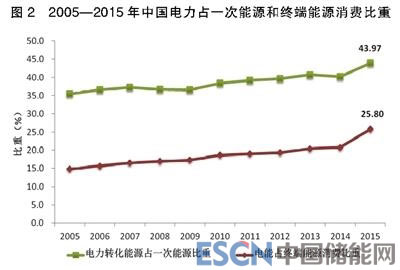 當(dāng)前我國(guó)與發(fā)達(dá)國(guó)家電能在終端能源消費(fèi)中的比重持平,且我國(guó)還略高于英國(guó)等發(fā)達(dá)國(guó)家。這種現(xiàn)象使一些專家認(rèn)為,我國(guó)電能占終端能源比重不會(huì)再提高。筆者認(rèn)為,發(fā)達(dá)國(guó)家天然氣在終端能源消費(fèi)中的比重約為25%,而我國(guó)在7%左右,我國(guó)計(jì)劃在2020年力爭(zhēng)達(dá)到10%,2030年達(dá)到15%左右。制約天然氣發(fā)展的主要因素是資源、價(jià)格以及相對(duì)于可再生能源碳排放仍然較高的特性。要提高我國(guó)終端能源消費(fèi)的清潔化,需要同步提高可再生能源發(fā)電比重及電能在終端能源消費(fèi)中的比重(見(jiàn)圖2)。