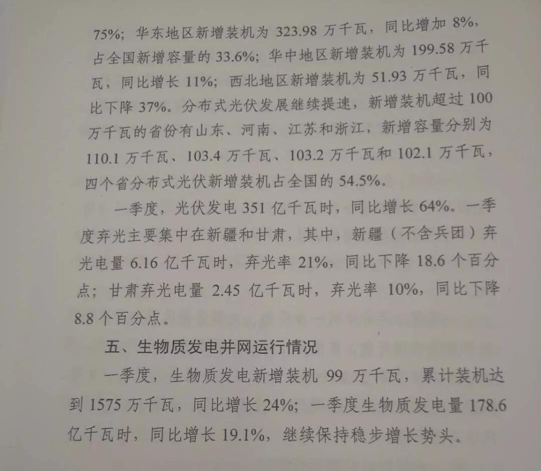 可再生能源利用水平顯著提高。一季度,可再生能源發(fā)電量達(dá)3442億千瓦時(shí),同比增長(zhǎng)14%;可再生能源發(fā)電量占全部發(fā)電量的22%,同比上升1.4個(gè)百分點(diǎn)。一季度,全國(guó)基本無棄水;棄風(fēng)電量91億千瓦時(shí),棄風(fēng)率8.5%,同比下降7.9個(gè)百分點(diǎn);棄光電量162億千瓦時(shí),棄光率4.3%,同比下降54個(gè)百分點(diǎn)。