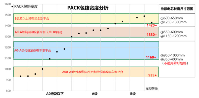 通過(guò)對(duì)當(dāng)前市場(chǎng)上的主銷(xiāo)車(chē)型寬度進(jìn)行分析,如1-1圖所示,主流的A0-A級(jí),以及B級(jí)以上的平臺(tái)適用于長(zhǎng)度1150mm-1300mm的長(zhǎng)電芯,但如果都按照比亞迪“漢”所標(biāo)配的1m或1m以上長(zhǎng)度做電芯,勢(shì)必會(huì)顧此失彼,結(jié)果便是某款車(chē)可能匹配較好,另外一些就裝不下,或者空間不能得到有效利用,這就違背了提高空間利用率的初衷?!耙簿褪钦f(shuō),過(guò)長(zhǎng)的尺寸會(huì)降低對(duì)市場(chǎng)主流乘用車(chē)的適配性和靈活性,從整車(chē)角度來(lái)看,我們?nèi)匀恍枰獮槠湔业揭粋€(gè)‘合適的’標(biāo)準(zhǔn),這一點(diǎn)很重要?!睏罴t新表示。