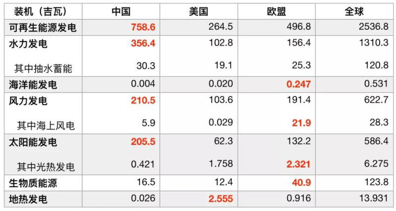 在各類不同的可再生能源中,中國在水電(占全球裝機(jī)的27.2%)、太陽能(35.0%)領(lǐng)先、風(fēng)電(33.8%);歐盟在海上風(fēng)電(77.4%)、生物質(zhì)能源(33.0%)、海洋能發(fā)電(46.5%)、光熱發(fā)電(37.1%)處于領(lǐng)先地位;美國僅在地?zé)岚l(fā)電領(lǐng)先(19.3%)。此外,中國的抽水蓄能也超過了歐盟,占全球25.1%。
