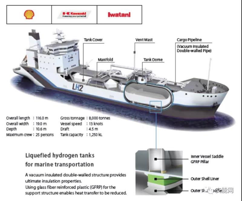 該供應(yīng)鏈的氫氣來源是澳大利亞拉特羅布山谷的褐煤,經(jīng)過重整制得氫氣。褐煤雖然儲量大,但含水量大,熱值低,不利于發(fā)電,且容易自燃,不利于運輸,所以當(dāng)?shù)貢苯愚D(zhuǎn)化成氫氣。氫氣經(jīng)過凈化、運輸至港口并就地液化。如何將大量的-253°C的液化氫氣安全地運到9000公里外的日本是個巨大的挑戰(zhàn)。為此,川崎重工制造了全球首艘液化氫氣運輸船“SUISO FRONTIER”號,并于2019年12月下水,次年3月完成液化氫儲罐吊裝,預(yù)計10月海試,明年試運營。
