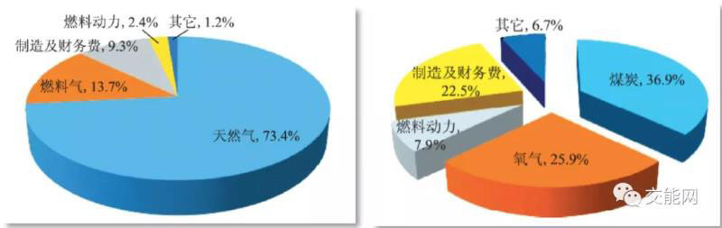 氫能技術(shù)中的成本主要來自于制氫的環(huán)節(jié),而制氫技術(shù)的成本都明顯受原料價格的影響,尤其是電解水制氫,電費占總成本比例超90%,因而對電價的高低十分敏感。熱化學(xué)重整制氫方面,依據(jù)2017年的經(jīng)濟情況,建模分析了煤制氫和天然氣制氫的成本結(jié)構(gòu),結(jié)果如下: