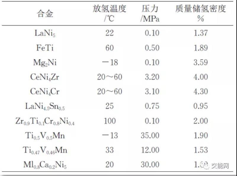 研究發(fā)現(xiàn),一些過渡金屬能夠在不同的溫度下,與氫氣發(fā)生不同程度的結(jié)合,形成金屬氫化物。從這一思路出發(fā),提出了金屬氫化物儲氫的技術(shù)路線。常用的儲氫材料及其性能如下圖: