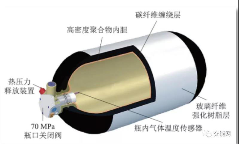 高壓氣態(tài)儲氫是目前應(yīng)用最為廣泛,技術(shù)最為成熟的儲氫方式。通過將氫氣加壓至35Mpa-70Mpa壓至儲氫瓶中,實現(xiàn)氫氣的集中儲存。高壓氣態(tài)儲氫的技術(shù)關(guān)鍵在于儲氫瓶的材料和設(shè)計。一方面要能夠承受較大的壓強,另一方面要能夠抵抗氫脆,同時還應(yīng)有良好的密封性,防止氫氣泄漏。目前,高壓氣態(tài)儲氫容器主要分為純鋼制金屬瓶(I型)、鋼制內(nèi)膽纖維纏繞瓶(II型)、鋁內(nèi)膽纖維纏繞瓶(III型)及塑料內(nèi)膽纖維纏繞瓶(IV型)。壓力對儲氫瓶的儲氫能力起到?jīng)Q定性作用,壓力大的儲氫瓶能儲存更多的氫氣,但也對材料、結(jié)構(gòu)和密封提出了更高的要求。中國車載儲氫中主要使用35 MPa 的III 型瓶,70 MPa 瓶也已研制成功并小范圍應(yīng)用。而日本豐田汽車公司等國外企業(yè)已經(jīng)研制成70Mpa的IV型瓶,并廣泛用于其生產(chǎn)的Mirai燃料電池車中,下圖為其結(jié)構(gòu):