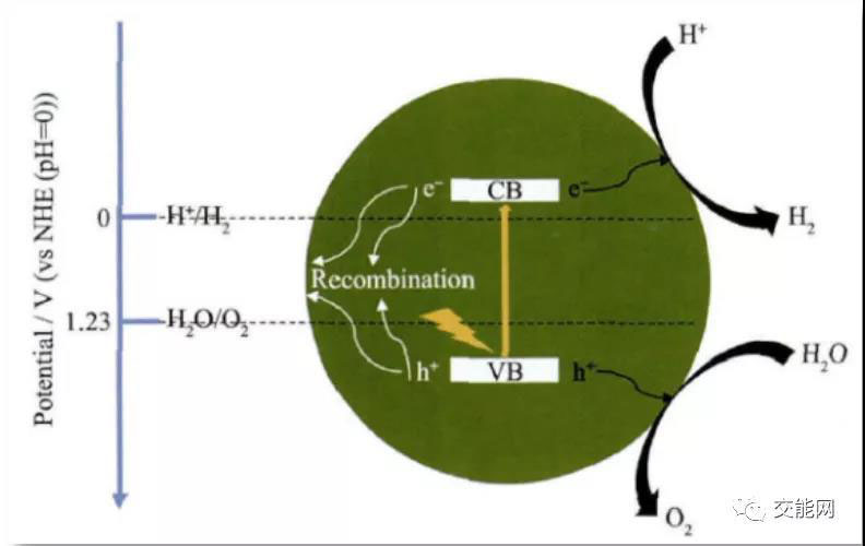 相比于已經(jīng)進入工業(yè)應(yīng)用環(huán)節(jié)的熱化學(xué)重整制氫和電解水制氫,光解水制氫目前還處在研發(fā)階段。光解水制氫,全稱光催化方法分解水制氫,其原理與電解水類似。受熱力學(xué)制約,水的分解必須在外加電壓大于1.299V,通常為1.7V的條件下進行。而光解水就是利用半導(dǎo)體催化劑,在受到光照的條件下,在水中產(chǎn)生具有足夠氧化還原能力的電子-空穴對,以實現(xiàn)水的分解。具體分為三步:(1) 半導(dǎo)體受光激發(fā)。半導(dǎo)體吸收能量等于或大于自身帶隙的光子,價帶中的電子被激發(fā)到導(dǎo)帶中,在導(dǎo)帶中就多了帶負電荷的電子(e-),在價帶中則留下帶正電荷的空位(稱之為空穴,h+),二者統(tǒng)稱光生載流子。