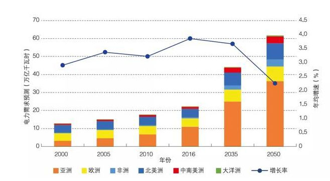 電能輸送方便,可高效轉(zhuǎn)化為各類形式的能源,電氣化是清潔能源大規(guī)模開發(fā)利用的必然要求。2035年左右,電能將超過石油成為終端第一大能源品種。2050年,全球用電量達(dá)到60萬億千瓦時(shí)以上,電能占終端能源比重超過50%。