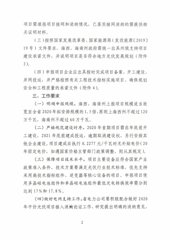 根據(jù)文件,2020年首期項(xiàng)目需在年底前開(kāi)工建設(shè),2021年底前建成投運(yùn),逾期取消建設(shè)權(quán);項(xiàng)目建成后執(zhí)行0.2277元/千瓦時(shí)無(wú)補(bǔ)貼電價(jià);原則上一個(gè)投資主體在各州只能申報(bào)一個(gè)項(xiàng)目。