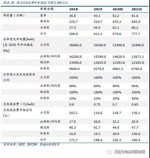 目前充電樁運營公司以向用戶收取充電服務費為主要盈利模式,政府對充電服務費設置了可收取上限,不同省市有所差異,價格在0.5-1.5元/kwh不等,公交車相對較低。預計2021年新能源汽車保有量將達到777萬,以0.8元/kwh作為假設測算基礎,并假設每年下降幅度0.05元/kwh,則2021年充電運營服務市場規(guī)模約340億元,隨著用戶規(guī)模增長,充電樁運營企業(yè)有望以更加針對性和多樣化的增值服務方式實現用戶價值變現,全市場空間大,具備藍海潛力。